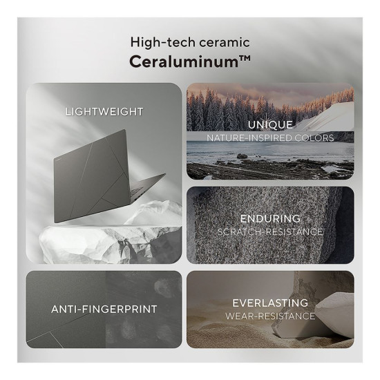 Weighing just 2.65 lbs and measuring only 0.47 inches in thickness, the ASUS Zenbook S 14 combines a sleek all-metal body with a unique Ceraluminum™ lid. Its premium design is as functional as it is stylish, making it the perfect choice for professionals on the move.