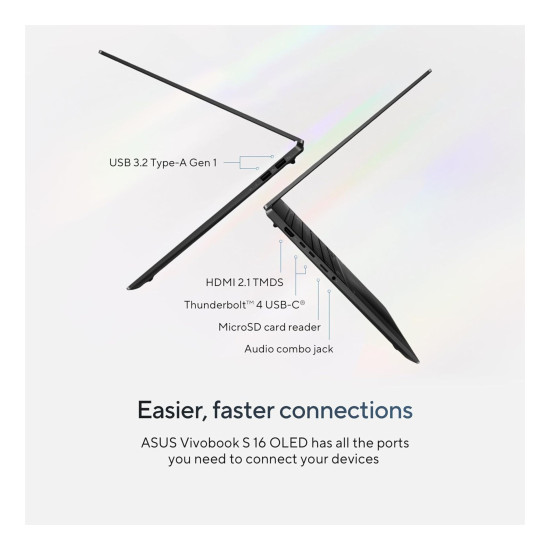 Stay connected with advanced wireless technology and a range of ports that make syncing devices and transferring data effortless. Whether you're working remotely, attending virtual meetings, or collaborating with a team, the VivoBook S 16 keeps you in touch and in control.