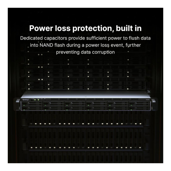 Dedicated capacitors provide sufficient power to flush data-in-flight into NAND flash during a power loss event, further preventing data corruption.