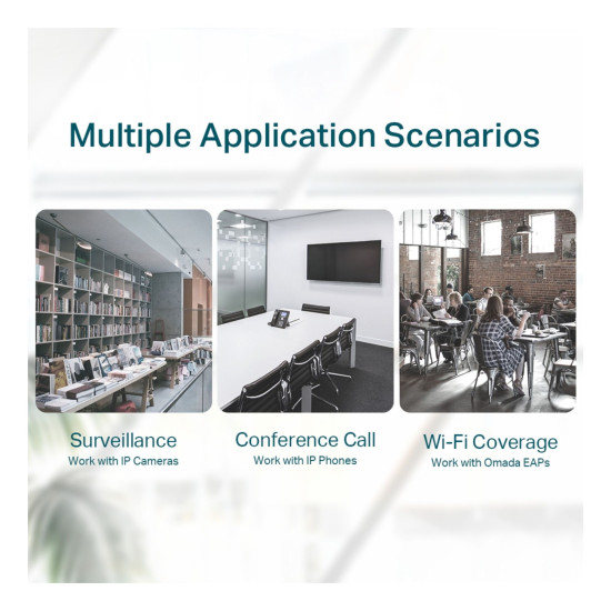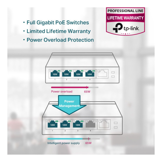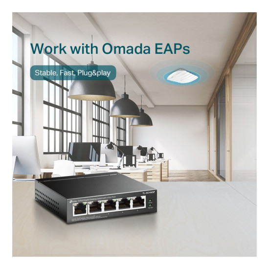 TL-SG1005P is a 5 10/100/1000Mbps ports unmanaged switch that requires no configuration and provides 4 PoE (Power over Ethernet) ports. It can automatically detect and supply power with all IEEE 802.3af compliant Powered Devices (PDs). In this situation, the electrical power is transmitted along with data in one single cable allowing you to expand your network to where there are no power lines or outlets, where you wish to fix devices such as APs, IP Cameras or IP Phones, etc.
