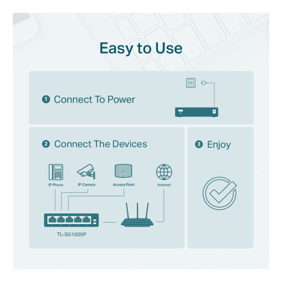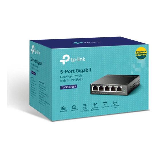 TL-SG1005P is easy to install and use. It requires no configuration and installation. With desktop design, outstanding performance and quality, the TP-Links TL-SG1005P 5-Port Gigabit Desktop Switch with 4-Port PoE is an ideal choice for expanding your home or office network.