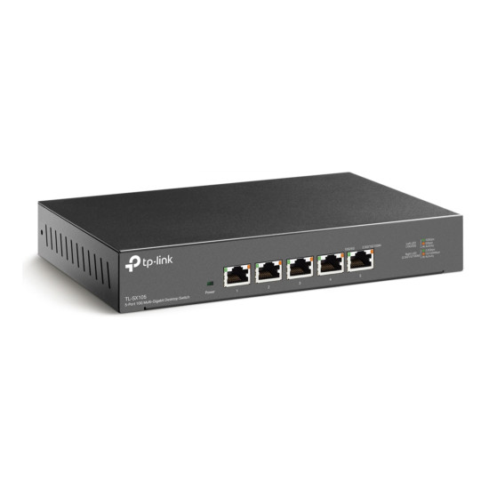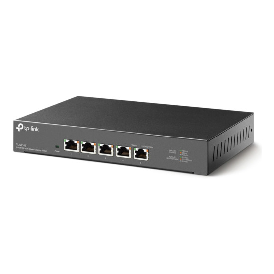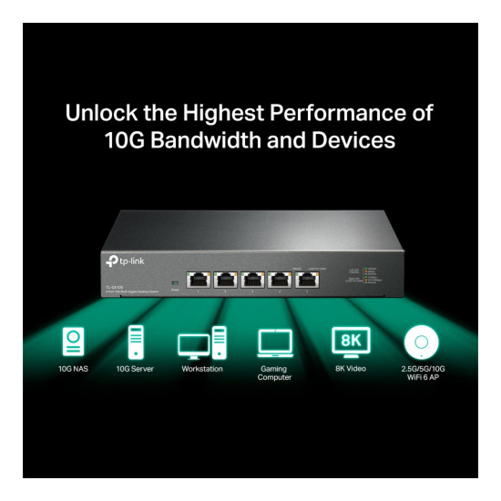 As the flagship 10G product, TL-SX105 is a 5-port 10G desktop switch, providing up to 100 Gbps of switching capacity. Auto-negotiation 5-speed (100Mbps/1G/2.5G/5G/10G) connections sense the link speeds and intelligently adjust for compatibility and optimal performance for all your devices, including 10G NAS, 10G server, workstation, gaming computer, 2.5G/5G/10G WiFi 6 AP, 8K video, desktop, and more.
