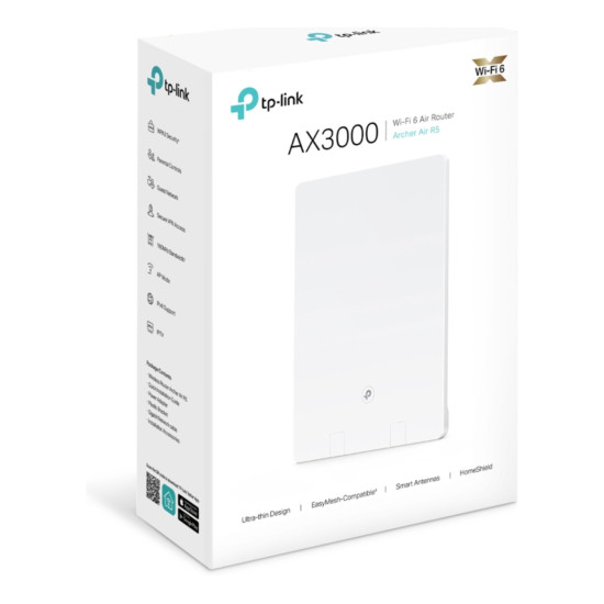 Ultra-Thin Design, Extraordinary PerformanceThe Archer Air R5 offers great performance in an ultra-thin design. It features 2402 Mbps on 5 GHz and 574 Mbps on 2.4 GHz band to ensure smoother streaming and faster downloads. It uses intelligent algorithms to auto-detect your devices locations and adjust antennas direction for all-round stable signals. Compatible with EasyMesh and secured with TP-Link HomeShield, you can be sure to get the very best out of your WiFi.