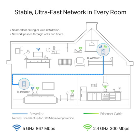 Provides ultra-fast powerline transfer speeds of up to 1300 Mbps*.