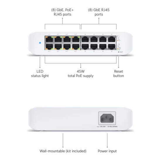 The Ubiquiti UniFi Switch Lite 16 PoE is a fully managed Layer 2 switch with sixteen Gigabit Ethernet ports for your RJ45 Ethernet devices. Eight ports also offer auto-sensing 802.3at PoE+ that provide up to a total of 45W PoE wattage for UniFi Access Points or other PoE devices.