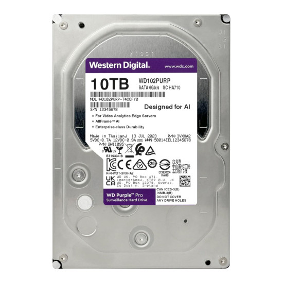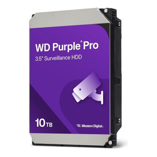 The 10TB Purple Pro 7200 rpm SATA III 3.5" Internal Surveillance Hard Drive from WD is designed for high-end AI-enabled recorders, video analytics appliances, deep-learning servers, and cloud solutions that can benefit from high-capacity storage with high performance and additional workload capability. With support for up to 64 high-definition surveillance cameras, this 10TB hard drive features AllFrame AI technology, which helps reduce frame loss, improve video playback, enables the recording of multiple streams per camera, and supports up to 32 AI streams per drive for deep learning analytics within the system.